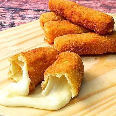 Porção de queijo mussarela a milanesa feito em casa , porção de 10 unidades.